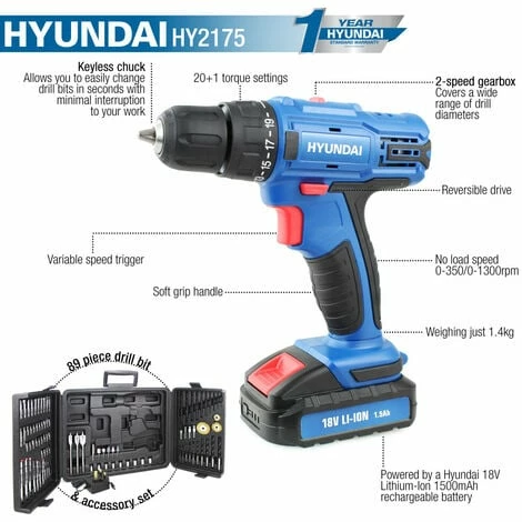 18v 1500mAh Li-Ion Battery, *Lithium-Ion Battery Charger, *Carry Case, *89 Piece accessory kit……………..89 Piece Accessory Kit Includes: *A selection of popular sizes of HSS twist drills., *Tungsten carbide tipped masonry drills., *Wood-boring drills., *Flat wood drill bits., *Rotary burrs., *Wire brushes., *A combination of 25mm and 50mm screwdriver bits…….Warranty: Covered by Hyundai 1-year standard warranty………….Product features: **Spindle Lock to Prevent Accidental Starting, *Electronic Brake to Increase Battery Life and Reduce Injury Risk, *89 Piece Drill Bit and Accessory Kit in a Robust Carry Case, *Battery Temperature Thermal Protection, *Covered by Hyundai 1-year warranty……………….Product Specs: *Model Number HY2175, *Power (V) 18v, *Chuck (mm) 10mm Keyless, *Battery 18v Li-Ion 1500mAh, *Speed (rpm) 0-350 / 0-1300rpm, *Torque & Settings 20NM / 20+1 settings, *Charging Time 3-5 Hours, *Maximum Drilling Capacity Steel Ø 10mm / Wood Ø 25mm, *Sound Pressure Level 69.88 dB(A), *Sound Power Level 80.88 dB(A), *Vibration Level (Drill) ah = 0,685 m/s² K= 1,5 m/s², *Vibration Level (Screwdriver) ah = 1,030 m/s2 K= 1,5 m/s², *Rated Input Voltage 220-240v 50/60Hz, *Rated Input Power 0.3A, *Rated Output Voltage 21.5v, *Net Weight (kg) 1.4kg