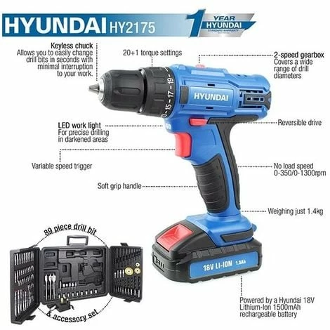18v 1500mAh Li-Ion Battery, *Lithium-Ion Battery Charger, *Carry Case, *89 Piece accessory kit……………..89 Piece Accessory Kit Includes: *A selection of popular sizes of HSS twist drills., *Tungsten carbide tipped masonry drills., *Wood-boring drills., *Flat wood drill bits., *Rotary burrs., *Wire brushes., *A combination of 25mm and 50mm screwdriver bits…….Warranty: Covered by Hyundai 1-year standard warranty………….Product features: *Built-In LED Work Light for Help in Low Light Areas, *Spindle Lock to Prevent Accidental Starting, *Electronic Brake to Increase Battery Life and Reduce Injury Risk, *89 Piece Drill Bit and Accessory Kit in a Robust Carry Case, *Battery Temperature Thermal Protection, *Covered by Hyundai 1-year warranty……………….Product Specs: *Model Number HY2175, *Power (V) 18v, *Chuck (mm) 10mm Keyless, *Battery 18v Li-Ion 1500mAh, *Speed (rpm) 0-350 / 0-1300rpm, *Torque & Settings 20NM / 20+1 settings, *Charging Time 3-5 Hours, *Maximum Drilling Capacity Steel Ø 10mm / Wood Ø 25mm, *Sound Pressure Level 69.88 dB(A), *Sound Power Level 80.88 dB(A), *Vibration Level (Drill) ah = 0,685 m/s² K= 1,5 m/s², *Vibration Level (Screwdriver) ah = 1,030 m/s2 K= 1,5 m/s², *Rated Input Voltage 220-240v 50/60Hz, *Rated Input Power 0.3A, *Rated Output Voltage 21.5v, *Net Weight (kg) 1.4kg