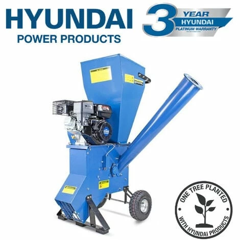 The Hyundai HYCH700 Wood Chipper is one exceptionally sturdy, efficient and powerful unit which is driven by a 208cc / 7hp OHV 4-stroke unleaded petrol Hyundai engine and has been proven to be ideal for chipping/ shredding wood, twigs, trimmings and branches effortlessly and thereby, transforming the loads of garden waste into more convenient and compostable constituents easily. With no tussle with back breaking and time lost in cutting any garden waste for easy discarding, this robust Hyundai wood chipper of 70kg is the perfect unit for gardeners and landscapers. Expertly engineered with a front handle and two off road pneumatic tyres, the operator can easily move around the garden or uneven grounds. Additionally, thanks to the two in-feed points, the large aperture hopper ensures quick and well-organized deposition of leaves, grass trimmings as well as any supplementary green garden rubbles whereas the smaller cone shaped chute has been perfectly equipped so as to tackle branches up to 76mm in diameter. IN THE BOX: HYCH700 Petrol Wood Chipper, x2 Pneumatic Tyres & User Manual. Warranty: Covered by Hyundai UK 3-year platinum warranty. Product Features: *Incredible 2400 – 3600rpm blade speed., *High-torque belt-type transmission., *Covered by Hyundai UK 3-year warranty, *208cc / 7hp heavy duty 4-stroke Hyundai engine., *2 pneumatic tyres & front handlebar for easy manoeuvrability., *Dual input-chutes for ease of use up to 76mm maximum chipping capacity., *2 HSS blade drum mechanism designed to draw in and chip branches., *Covered by Hyundai UK 3-year warranty…….Product Specs: *Gross Weight (kg)            75.00, *Model   HYCH700, *Engine Size         208cc 4 Stroke OHV Single Cylinder, *Starting System Recoil, *Output 7HP, *Oil Capacity        0.6L, *Net Weight (kg) 70kg, *Chipping Capacity (mm) 76.00, *Disc Speed (rpm)             2400rpm, *Knives   2 HSS, *Tyres     Pneumatic, *Boxed Dimensions (L x W x H)     1031x865x1350 mm…………( DELIVERY UPDATE: Please note that we offer Free Shipping to Mainland UK only! All other deliveries to any British Islands, Channel Islands, Isle of Wight, Isle of Man, Scilly Isles, the North of Scotland and Scottish Highlands & Islands will come with additional delivery charges. Due to circumstances beyond our control, we’re unfortunately now no longer able to deliver to residential addresses in Northern Ireland & Ireland)