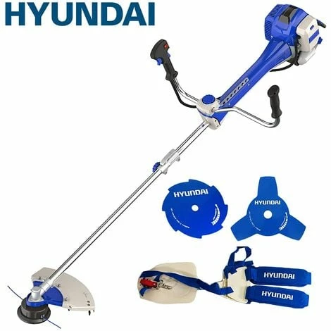 The HYBC5080AV is a powerful straight/split shaft, brush cutter/grass trimmer powered by the Hyundai 50.8 cc two-stroke high torque, low emissions recoil start petrol engine. The 50.8 cc engine has ideal mid-range torque so the machine does not have to be operated at maximum revs when cutting through heavy undergrowth. This makes for a more pleasant, quieter user experience and reduces fuel consumption, whilst promoting long engine life. Ideal for cutting through tough weeds, brambles, dense scrub and overgrown grass in both domestic and professional settings with a large 450 mm cutting width from the nylon trimmer head and 255 mm from either of the two steel cutter blades. Equipped with a fully enclosed anti-vibration system and bike or cow horn handles angled relative to the shaft reduces stress and fatigue on the operator’s arms and back, which is essential for extended periods of use. Supplied with a high-quality bump feed two-string nylon cutting head for use as a grass trimmer and two metal cutting blades for use as a brush cutter, with three and eight teeth. The three tooth blade would be used for brambles etc and the eight tooth blade for thicker wood like growth where a sawing action is required. The nylon string is used on grass and next to hard obstacles, with the cutting blades ideally used on thicker weeds, brambles and scrub. The nylon trimmer head we use has been chosen for its ease of replacing the nylon cord. The cord is 2.5 mm diameter and can be changed with ease. With the weight of just 9.68 kg, it is easy to use with the high quality fully padded ergonomic harness which spreads the load improving comfort and efficiency for the user allowing for easy transportation with the folding handles and split shaft. The on/off switch, throttle control and safety trigger are mounted on the right-hand grip, providing easy, precise and safe control. The full harness can be attached to the machine with the multi-position quick release connector allowing you to set it up so the balance is suitable for you. Shipping to any mainland UK address is free, however, there may be a charge for shipping to islands or Ireland. If you are looking for a lightweight strimmer from Hyundai please take a look at the HYTR2650 model. Box Contains: 1 x Main unit, 1 x Operators handle, 1 x Bump feed nylon trimmer head, 1 x 3 Tooth steel blade, 1 x 8 Tooth steel blade, 1 x Spare 2.5 mm nylon cord, 1 x Full harness, 1 x Gloves, 1 x Face shield, 1 x Ear Defenders, 1 x Tool kit, 1 x Bosh spark plug, 1 x Two Stroke mixing bottle, 1 x Manual, 1 x Quick start guide ( DELIVERY UPDATE: Please note that we offer Free Shipping to Mainland UK only! All other deliveries to any British Islands, Channel Islands, Isle of Wight, Isle of Man, Scilly Isles, the North of Scotland and Scottish Highlands & Islands will come with additional delivery charges. Due to circumstances beyond our control, we’re unfortunately now no longer able to deliver to residential addresses in Northern Ireland & Ireland)