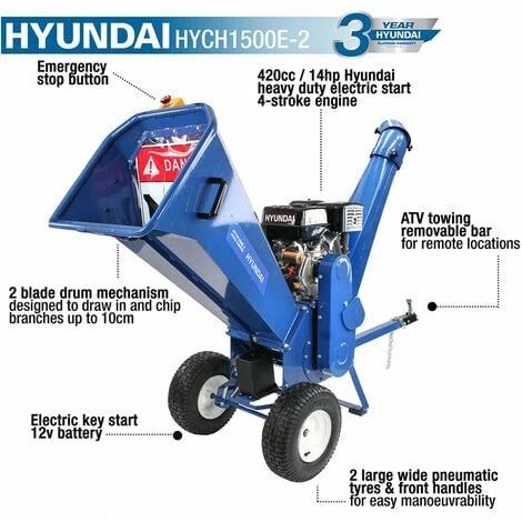 The HYCH1500E-2 is an extremely powerful and easily transportable wood chipper from Hyundai, powered by the proven 420cc / 14hp 4-stroke OHV electric start heavy duty Hyundai engine. The HYCH1500E-2 is capable of chipping and shredding large quantities of wood and branches into easily handled chippings quickly and effortlessly.