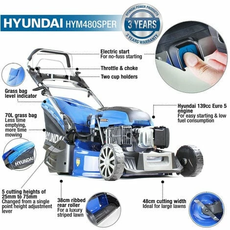 The HYM480SPER is a low maintenance self-propelled RWD (rear wheel drive) electric push button start petrol roller lawnmower from Hyundai. The HYM480SPER is specifically designed for mowing stripes into your lawn. Suited for medium to large sized lawns, the HYM480SPER has a cutting width of 480mm and features a split rear roller for easy turning and giving your lawn a striped finish.