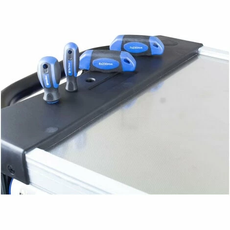Designed for mechanics both home and professional the HYTC9004 is a 7 drawer caster mounted tool chest from Hyundai. 7 drawers are filled with a 305 tool assortment. Includes extra storage cupboard, 2 document holders, and 1 blue roll holder.