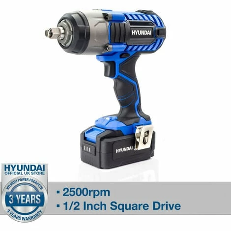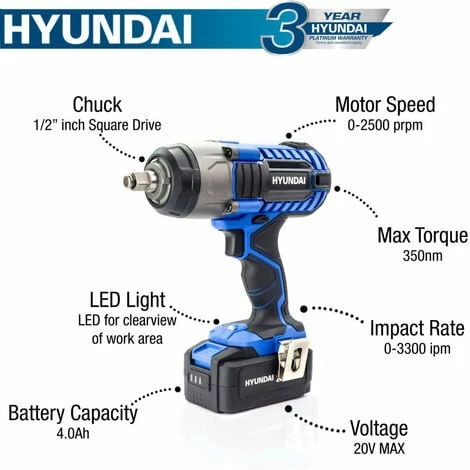 The Hyundai HY2178 is a brand new compact cordless impact wrench brand in the 20v MAX range, and has been specially designed for tightening and loosening bolts and lug nuts, as well as other types of heavy-duty fasteners, able to provide a 3300icm impact rate and 350Nm torque. This Hyundai impact wrench has the capacity to easily ensure a high torque output so as to remove even the most stubborn of fixtures, and has proven to be ideal for car maintenance or for any timber/steel construction projects. Additionally, the Hyundai impact wrench HY2178 has been perfectly equipped with a half-inch square drive and hor ring anvil, making it the best unit for mechanics who will need to quickly change out the sockets without needing to use any tools to release the socket from the anvil. Plus, it also comes with an in-built LED light for easy visibility even in low-light areas. The HY2178 impact wrench from Hyundai also has a soft-grip handle for added comfort and weighs just under 2kg for ease of use even in tight or awkward spaces. It even has a clip to fit it to your belt for hands-free carrying between tasks…………………………………At A Glance: Interchangeable battery: Power the whole Hyundai 20v garden machinery and power tool range from the same battery , 20V MAX battery-operated impact wrench: Suitable for tightening and loosening lug nuts and bolts , Weighs just 1.95kg: This impact wrench is easy to use even in tight or awkward spaces, In-built LED light: For a clear view of your working area, 3 year home-use warranty* / 1 year commercial warranty*, Low maintenance and easy-to-use 20v MAX cordless impact wrench, ½” square drive, Weighs just 1.95kg, 2500rpm, 3300icm impact rate, Has LED light for ease of use in dark environments, Battery charges from flat to full in just 70 mins, Interchangeable battery – the same battery powers our entire 20v range of power tools and garden machinery, Includes accessory kit and tool bag: Suits a huge range of DIY and automotive tasks, Includes 4.0aH lithium-ion battery and charger: No cables, no petrol and no pollution…………………………………..PRODUCT SPECS: Model HY2178, Start Method Battery, Bolt Capacity 36, Impact Rate (IPM) 0-3300, Max Torque (NM) 350, Chuck Type Fixed Square Head, Chuck Capacity (inch) 1/2″, No Load Speed (RPM) 0-2500, Battery Type 18650-Li, Battery Capacity (Ah) 2, Voltage (v) 20, Run Time (mins) 10-25 (Depends on working condition), Charging Time (mins approx.) 140, Number of Batteries 1, Battery Lifespan (charges) 1000+, Motor Type Brushed, Sound Level (dB) 87, Sound Power Level (dB) 98, Vibration Level 8,49 m/s2, Gross Weight (kg) 3.8, Net Weight (kg) 1.95, Fully Assembled Dimensions (H x W x L) (mm) 79 x 253 x 23, Package Dimensions (H x W x L) (mm) 278 x 178 x 253, Fuel Type / Power Source Battery, Product Type Impact Wrench, Warranty (years) 3, Commercial Warranty (years) 1………………………In The Box: HY2178, 4.0Ah Battery, 2A Charger, Canvas Bag, User Manual…………………..( DELIVERY UPDATE: Please note that we offer Free Shipping to Mainland UK only! All other deliveries to any British Islands, Channel Islands, Isle of Wight, Isle of Man, Scilly Isles, the North of Scotland and Scottish Highlands & Islands will come with additional delivery charges. Due to circumstances beyond our control, we’re unfortunately now no longer able to deliver to residential addresses in Northern Ireland & Ireland)