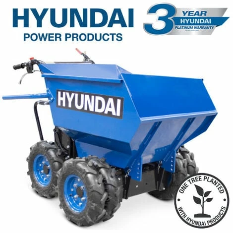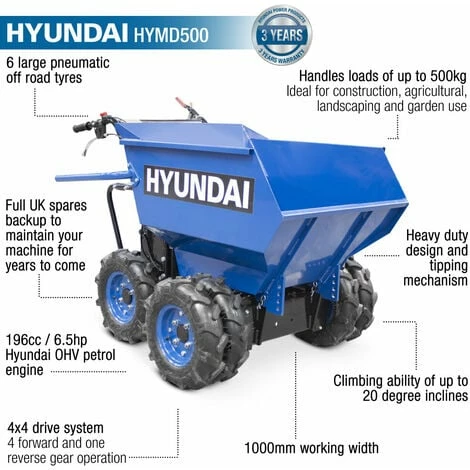 The HYMD500 Hyundai Mini Dumper is one heavy-duty dumper which comes with a 4×4 drive system and has been proven to be very efficient in the loading and transporting for various types of loads on different terrains and can be therefore be used for a wide variety of applications such as constructions and worksites, agricultural, landscaping, garden maintenance and allotment purposes. This exceptional Hyundai power barrow consists of a manual gear operation with 4 forward and 1 reverse gear, which in turn makes the unit easily movable and transportable on even as well as uneven grounds. Plus, it comes with an ergonomic and user-friendly design which ensures less user fatigue and more work efficiency for various applications. This exceptional and outstanding mini dumper from Hyundai is also equipped with a chain drive 4-wheel drive which ensures friction advantages over driven designs of similar units, as well as a skid steer system which allows the user to spin nearly instantly without having to lift or drag. Additionally, this amazing power barrow has been proven to be perfect for a wide variety of materials and different workload owing to its strong steel front skip with a large 500kg capacity. Compact and yet powerful, this robust Hyundai mini dumper can easily fit through small and confined spaces and doorways whilst generating sufficient power with its Hyundai 196cc 6.5hp petrol engine, in order to carry irregular and heavy materials even at an inclined position of 20 degrees. Moreover, equipped with a bottom protection plate to avoid any kind of damage with stones or hard objects and with four large pneumatic off-road tyres, with central wheel engaging 4-wheel drive, this power barrow can easily carry and load things on rough surfaces. The operator simply has to push the mini dumper into place, apply the parking disc brake for absolute security, fill in the barrow and easily transport a load from one place to another……..In The Box: Hyundai HYMD500 Mini Dumper, Assembly Tools & User Manual…..Warranty: Covered by Hyundai 3-year warranty……….Product Features: • Handles loads of up to 500kg ideal for construction, agricultural, landscaping and garden use, • Climbing ability of up to 20-degree inclines, • 700mm working width to allow it to pass through a standard doorway or confined space, • 4×4 drive system (4 forward and one reverse gear operation), • 196cc / 6.5hp Hyundai OHV petrol engine, • Maximum capacity 500kg / 1/2 tonne, • Features 4 large multipurpose pneumatic off-road tyres, • Heavy duty design and tipping mechanism, • Full UK spares backup to maintain your machine for years to come, • Covered by Hyundai 3-year warranty……….Product Specs: • Model Number HYMD500, • Engine Type Hyundai IC200V OHV 4-Stroke, • Engine Size 196cc / 6.5hp, • Engine Speed 3600rpm, • Transmission Transaxle 3 Forward / 1 Reverse Speed, • Fuel Type Unleaded Petrol, • Load Capacity 500kg /1/2 tonne, • Oil Type SAE30 or 15W40 Engine Oil, • Dimensions L X W X H (mm) 1400x1000x1600mm, • Net Weight (kg) 170kg…..( DELIVERY UPDATE: Please note that we offer Free Shipping to Mainland UK only! All other deliveries to any British Islands, Channel Islands, Isle of Wight, Isle of Man, Scilly Isles, the North of Scotland and Scottish Highlands & Islands will come with additional delivery charges. Due to circumstances beyond our control, we’re unfortunately now no longer able to deliver to residential addresses in Northern Ireland & Ireland)