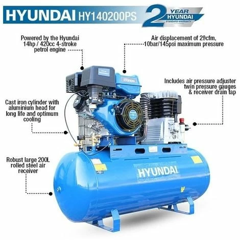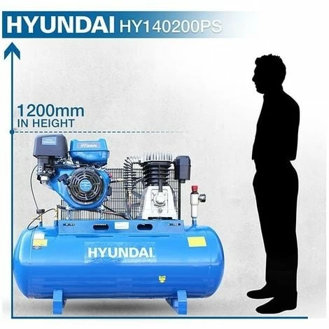 The Hyundai HY140200PES Petrol Air Compressor is one exceptional and robust unit with a powerful 14hp twin cylinder cast iron belt drive which has been specially engineered for professional applications such as mobile tyre-fitting vehicles and other trade purposes. This is also a perfect machine for fuelling heavyweight commercial vehicles, 1” drive impact guns, inflating super single company vehicle tyres and amongst other overall heavy mobile use. The Hyundai HY140200PES Petrol Air Compressor is thus the perfect unit for professional applications in various settings with its outstanding performance and strength………In the Box: HY140200PES, 4 rubber feet, User manual………..Warranty: Covered by Hyundai 2-year standard warranty………….Product Specs: *Engine 14hp Hyundai IC420E, *Engine Type Hyundai IC420 Single Cylinder, 4-stroke, Forced Air Cooling, OHV E-Start, *Engine Size (cc) 420.00, *Oil Capacity (ml) 1100.00, *Fuel Capacity (L) 6.50, *Horsepower (hp/kW) 14/9.67, *Fuel Type Unleaded Petrol, *Engine Speed (rpm) 3000.00, *Pump Speed (rpm) 1050.00, *Start Method Recoil / Electric Start, *Maximum Pressure (PSI/Bar) 145 / 10, *Cut-in Pressure (PSI/Bar) 116/8, *Tank Capacity (L) 200.00, *Pump Displacement (CFM / L/min) 29/800, *Air Outlet Size (mm) 1/2″ BSP thread and 2 x Euro Q/R Fittings, *Dimensions L x W x H (mm) 1320 x 470 x 1200, *Tank Material Rolled Steel, *Net Weight 145kg………..( DELIVERY UPDATE: Please note that we offer Free Shipping to Mainland UK only! All other deliveries to any British Islands, Channel Islands, Isle of Wight, Isle of Man, Scilly Isles, the North of Scotland and Scottish Highlands & Islands will come with additional delivery charges. Due to circumstances beyond our control, we’re unfortunately now no longer able to deliver to residential addresses in Northern Ireland & Ireland)