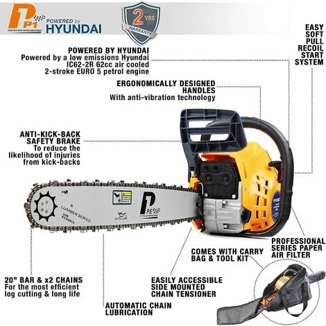 The P6220C 62cc 2-stroke petrol chainsaw from P1 is a heavy duty chainsaw designed to deal with tough sawing requirements. With a extremely powerful Hyundai ic62-2r 62cc 2-stroke engine fitted with 20-Inch bar & chain is capable of tackling anything from large trees to smaller clearance jobs. Weighing just 6.8kg including bar & chain makes the P6220C easy to transport and handle providing a comfortable user experience during extensive use. When not in use the P6220C can be stored safely with the included carry bag and bar cover that protects the all-important cutting links on the chain from getting damaged and keep the bar in pristine condition. Designed for both heavy duty & home use the P6220C is a very versatile chainsaw delivering high performance in all conditions. The side mounted chain tensioner makes adjustment quick and easy. The automatic chain lubrication system ensures that the chain is always lubricated while in use to minimise on downtime and keep the chain in good health. The ergonomically designed handles are fitted with anti-vibration technology to increase comfort and protect the user’s hands, built with safety in mind the safety brake stops the chain instantly in the event of a kick-back. In the box you will receive: P6220C chainsaw, 20” bar & x2 chains, carry bag, tool kit (including Spark plug Spanner, flat head screwdriver, hex key & chain file) additional spare Spark plug & bar cover. ( DELIVERY UPDATE: Please note that we offer Free Shipping to Mainland UK only! All other deliveries to any British Islands, Channel Islands, Isle of Wight, Isle of Man, Scilly Isles, the North of Scotland and Scottish Highlands & Islands will come with additional delivery charges. Due to circumstances beyond our control, we’re unfortunately now no longer able to deliver to residential addresses in Northern Ireland & Ireland)