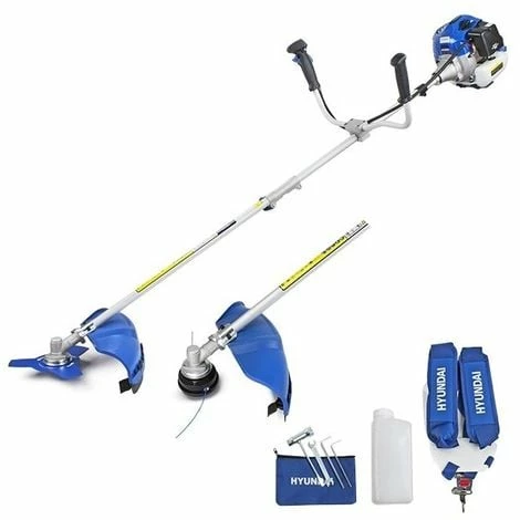 The Hyundai HYBC5200X Petrol Grass Trimmer / Strimmer / Brush Cutter is one exceptionally heavy-duty, versatile and highly efficient unit which comes with a 52cc 2-stroke Euro-V Hyundai low emission petrol engine and has been proven to be ideal for dual cutting purposes such as the cutting and trimming of various kinds of grass, bramble shrubs or overgrown ones. Plus, with a high mid0range torque, the user does not even need to revive the unit at maximum speed for ultimate performance. This highly adaptable Hyundai garden machinery is equipped with a superior quality bump feed, two-string nylon cutting head for use as a grass trimmer and a 3-tooth metal cutting blade to be used as a brush cutter. Also, this Hyundai trimmer strimmer brush cutter unit will guarantee comfort, no stress and no user fatigue during its applications, owing to the twin shoulder harness which easily fits and adapts to the user’s back, shoulders and arms without causing strain on the muscles. In The Box: HYBC5200X Grass Trimmer, Lower Shaft, Trimmer Head, 3 Tooth Blade, Double Harness Belt, Tool Kit, 2-Stroke Mixing Bottle & User Manual. Covered by Hyundai 3-year warranty. Product Features: Full double shoulder ergonomic harness and the multi-position attachment for an ideal balance., Covered by Hyundai 3-year warranty…………..Product Specs: Model HYBC5200X, Engine 52cc 2-Stroke EURO 5, Fuel Pre-mix Unleaded Petrol/ Semi-Synthetic 2-Stroke Oil, 40:1 Ratio, Engine Capacity 1.45 kW / 2.0HP, Fuel Capacity 1.2 Litres, Starting System Recoil / Pull Start, Drive Centrifugal Clutch / Split Shaft, Complete with Full Harness, Net Weight (kg) 9.10kg……….( DELIVERY UPDATE: Please note that we offer Free Shipping to Mainland UK only! All other deliveries to any British Islands, Channel Islands, Isle of Wight, Isle of Man, Scilly Isles, the North of Scotland and Scottish Highlands & Islands will come with additional delivery charges. Due to circumstances beyond our control, we’re unfortunately now no longer able to deliver to residential addresses in Northern Ireland & Ireland)