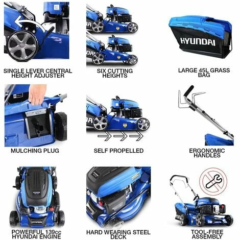 The HYM430SPE is a low maintenance self-propelled RWD (rear wheel drive) electric push button start petrol lawnmower from Hyundai. Suited for small to medium sized lawns up to approx. 20m x 20m the HYM430SPE features a cutting width of 420mm. The 139cc 4-stroke OHV petrol engine features low noise levels and fuel consumption keeping running costs to a minimum. The engine features push-button electric and recoil pull start, combine this with the electronic ignition system it makes starting effortless. This is the lightest push button electric start mower available by Hyundai. With six cutting heights controlled by a single point height adjuster can be changed from 25mm for a smooth lawn to 75mm for cutting longer grass, the HYM430SPE puts you in control over the finish of your cut. The HYM430SPE features rear discharge, mulching and grass collection options. With a spacious quick release 45L hard top polypropylene/polyester fabric grass catcher bag, you will spend less time emptying the cuttings and more time mowing. Attaching and removing the grass collector couldn’t be simpler, and this allows you to dispose of the cuttings quickly and conveniently. The self-propelled rear wheel drive is controlled from the rear mounted handle control. With OPC (Operator Presence Control) technology that ensures the engine will not run if you let go of the handle. For easy storage, the handles can fold down over the lawn mower making it very compact, ideal for the garden shed, garage or transporting within a vehicle. Weighing just 30kg, this is one of the lightest self-propelled petrol lawn mowers on the market. With low noise, low vibration and low emissions the HYM430SPE electric start petrol lawnmower is a first class all round garden petrol lawnmower. In The Box: HYM430SPE Petrol Lawnmower, 45L Grass Collector, Battery charger, Assembly Tools & User Manual. ( DELIVERY UPDATE: Please note that we offer Free Shipping to Mainland UK only! All other deliveries to any British Islands, Channel Islands, Isle of Wight, Isle of Man, Scilly Isles, the North of Scotland and Scottish Highlands & Islands will come with additional delivery charges. Due to circumstances beyond our control, we’re unfortunately now no longer able to deliver to residential addresses in Northern Ireland & Ireland)