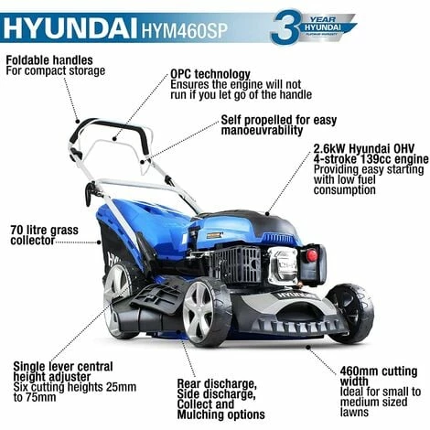 The Hyundai HYM460SP 18″ self-propelled lawn mower is a rear wheel drive, self-propelled mower, powered by an economical Hyundai 139cc OHV 4-stroke low emission petrol engine. It has been designed to offer you great features at an amazing price and gives you the choice of four different ways to deal with your grass cuttings: collection, rear discharge, side discharge and mulching. With tool-free assembly, you can be up and running in minutes. With a cutting width of 46cm, it is ideal for medium size lawns. The cutting height is easily adjustable to seven different positions from 25mm to 75mm all from a single wheel height adjustment lever. The engine is easily started thanks to the CDI ignition system and the drive to the rear wheels is controlled from the rear mounted handle control. The fully enclosed drive belt can be easily accessed through the new removable maintenance cover. With the added benefit of extra large self-drive wheels, the HYM460SP is easily manoeuvrable in overgrown grass and uneven areas. For added convenience this lawn mower is equipped with a large 70 litre capacity fabric and plastic grass box and comes fitted with a useful full-bag indicator to tell you when the box needs emptying, so you won’t need to stop and check. The fabric material also helps airflow which improves collection of grass cuttings. Fitted with a solid steel deck which offers extra strength, extends the life of the mower and also results in a higher quality feel. The deck can also be easily cleaned thanks to its fitted garden hose connection. The soft grip handles can be folded down, making for easy storage and transportation of the lawnmower. Comes with mulching plug and side discharge chute. Fitted with a hard wearing steel deck for extended long life. IN THE BOX: HYM460SP Petrol Lawnmower, 70L Polyester Grass Bag and User Manual ( DELIVERY UPDATE: Please note that we offer Free Shipping to Mainland UK only! All other deliveries to any British Islands, Channel Islands, Isle of Wight, Isle of Man, Scilly Isles, the North of Scotland and Scottish Highlands & Islands will come with additional delivery charges. Due to circumstances beyond our control, we’re unfortunately now no longer able to deliver to residential addresses in Northern Ireland & Ireland)