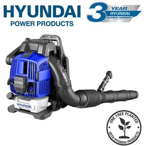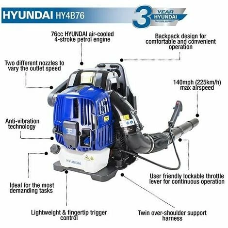 The Hyundai HY4B76 Petrol Leaf Blower is one of the most powerful, efficient and exceptional backpack leaf blower which is powered by a robust 76cc 4-stroke air-cooled single cylinder engine with EURO 5 engine certification. Ideal for generating an optimum airspeed of 140 mph (225 km/h) and with low fuel consumption and low emissions, this outstanding Hyundai leaf blower is the ultimate unit for both personal and professional applications. With the capability to run and maintain a high performance whilst running on straight unleaded petrol, this HY4B76 4-stroke leaf blower requires no 2-stroke oil mixing. IN THE BOX: Hyundai HY4B76 petrol backpack leaf blower, Double Shoulder Support Backpack Harness, Blower Nozzle & Tube with Trigger Control, Tool Kit & User Manual. Warranty: Covered by HYUNDAI 3-year warranty. Product Features: Powerful leaf blower with a huge 140mph (225km/h) max airspeed., Ergonomic design with anti-vibration system., Covered by Hyundai 3-year warranty., Strong and reliable petrol backpack leaf blower., Lockable throttle lever for ease over continuous use., Backpack harness for comfortable and convenient operation., Lightweight with fingertip trigger control., Hyundai 76cc air-cooled 4-stroke petrol engine….Product Specs: Model   HY4B76, Starting System Recoil, Model Number HY4B76, Engine Type 76cc Air Cooled, 4-Stroke, Single Cylinder, Fuel Type Unleaded Petrol, Ignition Type CDI, Starting Method Easy Start Recoil, Max Power 2.2Kw @ 7000rpm, Fuel Tank Capacity 1500ml, Max Air Speed  140mph, Air Velocity 87m/s, features Trigger Control, Backpack Design, Dimensions L X W X H (mm) 1370X450X510, Net Weight (kg) 12.30kg, Warranty 3 Years…….( DELIVERY UPDATE: Please note that we offer Free Shipping to Mainland UK only! All other deliveries to any British Islands, Channel Islands, Isle of Wight, Isle of Man, Scilly Isles, the North of Scotland and Scottish Highlands & Islands will come with additional delivery charges. Due to circumstances beyond our control, we’re unfortunately now no longer able to deliver to residential addresses in Northern Ireland & Ireland)