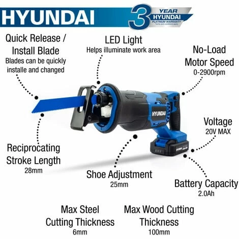 The Hyundai HY2181 is one exceptional and new cordless reciprocating saw which comes with a 20v MAX range, and has been designed for quickly making cuts and slices in wood and metal. With a capacity to handle cutting through up to 100mm of wood or 6mm of steel, this Hyundai reciprocating saw has proven to be perfect for a huge range of DIY projects. Plus, its stroke length of 28mm will also make quick work of the task at hand. Additionally, equipped with a quick change blade release system and adjustable shoe, you can easily swap the blades between tasks without any interruption. This Hyundai reciprocating saw also comes with an in-built LED light for easy visibility even in low light areas, as well as a soft-grip handle for added comfort……………………..At A Glance:Â 20V MAX battery-operated reciprocating saw: Suitable for quickly cutting through wood, plastic and metal with ease, Interchangeable battery: Power the whole Hyundai 20v garden machinery and power tool range from the same battery, In-built LED light: For a clear view of your working area, Includes battery and charger, 3 year home-use warranty* / 1 year commercial warranty*, Low maintenance and easy to use 20v MAX cordless reciprocating saw, Able to cut through 100mm of wood and 6mm of steel, 28mm stroke length, Lightweight at just 2.2kg, Has LED light for ease of use in dark environments, Battery charges in just 70 mins, Interchangeable battery – the same battery powers our entire 20v range of power tools and garden machinery, Comfortable and easy to use: Weighs just 2.05kg, Stroke length of 28mm: For quick and efficient cutting, Can cut through a range of materials: Slices through up to 6mm of steel or up to 100mm of wood, Includes 2.0aH lithium-ion battery and charger: No cables, no petrol and no pollution…………………………..Product Specs:Â Model HY2179, Start Method Battery, Capacity Steel (mm) 6, Capacity Wood (mm) 100, Stroke Length (mm) 28, Tool Blade Change Facility Quick Blade Change, Handle Type D, No Load Speed (RPM) 0-2900, Battery Type Lithium Ion, Battery Capacity (Ah) 2, Voltage (v) 20, Run Time (mins) 15-40 (Depends on working condition), Charging Time (mins approx.) 70 , Number of Batteries 1, Battery Lifespan (charges) 1000+, Motor Type Brushed, Sound Level (dB) 89, Vibration Level Cutting board:10,75 m/s2 | Cutting wooden beam:9,95 m/s2, Gross Weight (kg) 3.2, Net Weight (kg) 2.05, Fully Assembled Dimensions (H x W x L) (mm) 415 x 85x 180, Package Dimensions (H x W x L) (mm) 550 x 91x 165, Fuel Type / Power Source Battery, Product Type Cordless Reciprocating Saw, Warranty (years) 3, Commercial Warranty (years) 1………………………………….In The Box:Â HY2181, 2.0Ah Battery, 2A Charger, 150mm Wood Blade, 100m Metal Blade, User Manual……………….( DELIVERY UPDATE: Please note that we offer Free Shipping to Mainland UK only! All other deliveries to any British Islands, Channel Islands, Isle of Wight, Isle of Man, Scilly Isles, the North of Scotland and Scottish Highlands & Islands will come with additional delivery charges. Due to circumstances beyond our control, we’re unfortunately now no longer able to deliver to residential addresses in Northern Ireland & Ireland)