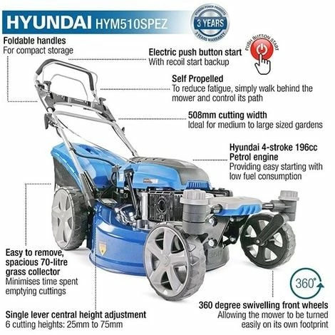 The Hyundai HYM510SPEZ Lawn Mower is one exceptional, sturdy and efficient self-propelled lawn mower which comes with a Hyundai 196cc petrol engine, a push button electric start, six different cutting heights, mulching option as well as four different speed drive system. This Petrol lawn mower from Hyundai has been specially designed with a pivoting front axle with zero turn as well as an ultra-low-cut in order to ensure a bowling green like finish for your lawn (NB: Please use this only on very flat and smooth lawns). This Hyundai lawn mower is also designed with swivelling front wheels so as to allow the operator to ‘spin on own footprint’ kind of manoeuvrability and hence, move around easily and comfortably. (NB: Latest models may differ slightly than those shown in the video due to continuous improvement.) Accessories Included: The HYM510SPEZ includes a side discharge chute….. In The Box: HYM510SPEZ Petrol Lawnmower, 70L Hard top Polyester Grass Bag, Side discharge chute, Battery charger, Engine Oil, User Manual………..Warranty: Covered by a Hyundai 3-year platinum warranty…….Product Features: *Electric push button start with recoil start backup, *508mm cutting width, Ideal for medium to large sized gardens, &Foldable handles for compact storage, *Full UK spares backup to maintain your machine for years to come, *Covered by Hyundai 3-year platinum warranty…………..Product Specs: *Gross Weight (kg) 47.40, *Model HYM510SPEZ, *Engine Model Hyundai IC200VE, *Engine Type 4-Stroke OHV Single Cylinder, *Power Method Petrol, *Engine Size 196cc, *Fuel Capacity (L) 1.00, *Rated Power (kW/kVA) 4.2kW, *Engine Speed 2800rpm, *Engine Oil Capacity 600ml, *Engine Oil 15w40, *CE Compliant Yes, *Drive Self Propelled, *Starting System Recoil and electric, *Height Adjustments Central Adjustment – 6 Positions, *Cutting Height 17mm – 75mm, *Cutting Width 508mm, *Catcher Volume (L) 70L, *Deck Material Steel, *Dry Weight 44kg, *Fully Assembled Dimensions H x W x L (mm) 1580 x 550 x 1050, *Fuel Unleaded Petrol, *Drive Self Propelled Variable Speed, *Safety Features OPC (operator presence control), *Cutting Options Rear Discharge, Side Discharge & Collect, *Recommended For Lawns Up To Large Lawns – Above 2000sq. ft………( DELIVERY UPDATE: Please note that we offer Free Shipping to Mainland UK only! All other deliveries to any British Islands, Channel Islands, Isle of Wight, Isle of Man, Scilly Isles, the North of Scotland and Scottish Highlands & Islands will come with additional delivery charges. Due to circumstances beyond our control, we’re unfortunately now no longer able to deliver to residential addresses in Northern Ireland & Ireland)