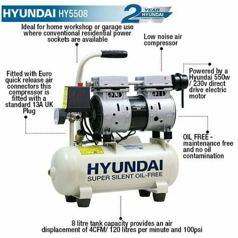 The HY5508 Hyundai Silent Air Compressor is one exceptional, powerful, robust, and compact air compressor with outstanding 550W direct drive, oil-free and low noise features. This unit has proven to be very helpful in various applications such as spray painting, blowing away dirt and dust, nailing, inflating tyres as well as to inflate or operate other air tools, hence making it a perfect DIY unit while being suitable for trade purposes too. This Hyundai air compressor is a very lightweight machine of only 15kg which comes completely oil-free and thereby, making it free from any potential risk of oil contamination in the air supply. Also, it can be easily transported or moved owing to its four sturdy rubber mounted feet and a carry handle for easy manoeuvrability. Additionally, the HY5508 Silent air compressor is the perfect unit for personal applications at home as well as professional purposes, for example at a garage, owing to its 230V standard mains supply, a 550W power motor which is directly connected to the oil-free air compressor pump and the rubber mount with low vibration. This noiseless air compressor is the ideal unit since it comes with a maintenance-free compressor, oil-less free diaphragm for clean air supply and conventional piston compressors for reduced noise. Moreover, with an 8-litre tank capacity, this outstanding air compressor provides an air displacement of 4CFM/ 120 litres per minute and a maximum pressure of 7 bar/ 100psi. Plus, this Hyundai air compressor is equipped with a standard 13A UK plug and euro quick release connectors. In The Box: HY5508 Electric Air Compressor, User Manual. Warranty: Covered by Hyundai 2-year standard warranty. Product Features: Includes automatic cut out switch, safety valve and pressure regulator, Covered by Hyundai 2-year warranty., OIL FREE – maintenance free and no oil contamination., Low noise air compressor., Powered by a Hyundai 550w / 230v direct drive electric motor., 8-litre tank capacity provides an air displacement of 4CFM/ 120 litres per minute and 100psi., Fitted with Euro quick-release air connectors this compressor is fitted with a standard 13A UK Plug…..Product Specs: Model  HY5508, Motor Power    0.55kW / 0.75hp, Max Pressure   8bar/118psi, Voltage 230v, 50hz, Air Displacement             120L/min, 4CFM, Discharge Pressure        7BAR / 100PSI, Tank Size            8L, Motor Speed    1040rpm, Air Outlet           Euro Quick Release, Sound Rating     60dB, Dimensions L X W X H (mm)       470X160X515, Net Weight        15kg……….( DELIVERY UPDATE: Please note that we offer Free Shipping to Mainland UK only! All other deliveries to any British Islands, Channel Islands, Isle of Wight, Isle of Man, Scilly Isles, the North of Scotland and Scottish Highlands & Islands will come with additional delivery charges. Due to circumstances beyond our control, we’re unfortunately now no longer able to deliver to residential addresses in Northern Ireland & Ireland)