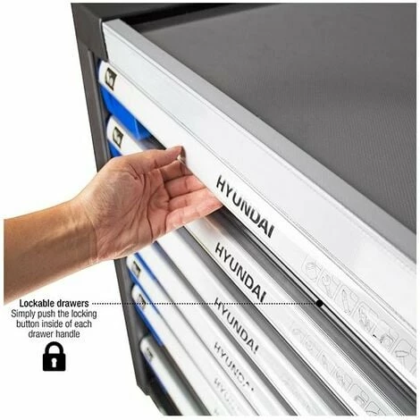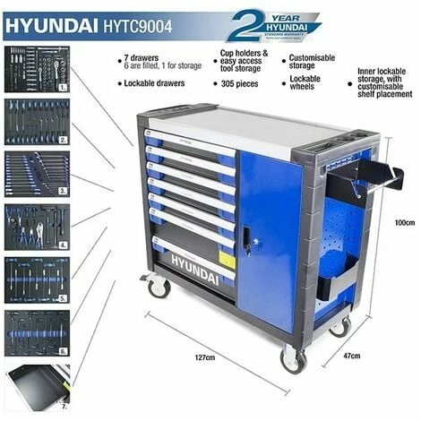 Premium Tool Chest – 305 Piece, 7 Drawers Caster Mounted Roller Tool Cabinet- The perfect tool chest for mechanics, for both professional and home use, containing professional grade socket set including T-shape set, screwdriver set, spannet set, wrench set including T handle set and hammer and plier set. The HYTC9004 boasts 7 drawers to ensure your tools are all securely stored and organised. Each drawer features a super smooth ball bearing mechanism that glides open effortlessly, all drawers include a liner to protect your tools from slipping. The caster mounted tool cabinet includes a large stainless steel work surface and the 7 drawers beneath are filled with a 305 tool assortment that includes: 195PCS SOCKET SET: 1 x Extensions, 1/2”, 125mm — 1 x Extensions, 1/2”, 250mm — 1 x 1/2” Socket for spark plugs, 16mm — 1 x 1/2” Socket for spark plugs, 21mm — 1 x 1/2” Sliding adaptor, 3/8”Fx1/2”M — 1 x 1/2” Universal joint — 2 x 1/4” POZIDRIV Bit socket, PZ1, PZ2 — 2 x 1/4” PHILLIPS Bit socket, PH1, PH2 — 3 x 1/4” SLOT Bit socket, 4, 5.5, 7mm — 2 x 1/4” Extension with hexagon drive, 50, 100mm, — 1 x Sliding T-bar, 1/4”, 110mm — 1 x 1/4” Square drive screwdriver, 150mm — 4 x 1/4” HEX Bit socket, 3, 4, 5, 6mm — 7 x 1/4” TORX Bit socket, T10, T15, T20, T25, T30, T8, T27 — 1 x 1/4” Universal joint — 7 x 1/4” TORX Tamperproof Bit socket, TH8, TH10, TH15, TH20, TH25, TH27, TH30 — 3 x 1/4” Bit socket TX, T9, PH0, PZ0 — 1 x 1/4” Bit socket TX tamperproof, TB9 — 8 x 1/4” Bit x 25mm, PH, PH2, PH3, PZ1, PZ2, PZ3, SL4, SL5, SL6mm — 8 x 1/4” Bit x 25mm, TX tamperproof, TH7, TH10, TH15, TH20, TH25, TH27, TH30, TH40 — 10 x 1/4” Bit x 25mm, TX: T6, T7, T8, T9, T10, T15, T20, T25, T27, T30 — 3 x 1/4” Bit spline XZN, 25mm, M5, M6, M8 — 8 x 1/4” Bit x 25mm, tamperproof five star, TS10, TS15, TS20, TS25, TS27, TS30, TS40, TS45 — 1 x 1/4” Bit x 25mm, TORX, T5 — 1 x 5/16” Bit x 30mm, TORX T30 — 1 x 5/16” Bit x 30mm, tamperproof TH30 — 1 x 3/8” Extension with knurling, 150mm — 1 x 3/8” Spark plug socket, 18mm — 1 x 3/8” Univeral joint — 11 x 1/4” TX E Socket, E4, E5, E6, E7, E8, 3/8” E10, E11, E12, E14, 1/2” E20, E24 — 1 x 1/4” Bit adaptor socket with clamping ring — 1 x 3/8” Bit adaptor socket, 3/8”x5/16”, 28mm — 2 x 3/8” TX E Sockets, E16, E18 — 1 x 1/2” Bit adaptor socket, 1/2”x5/16”, 38mm — 2 x 5/16” Bit PZ, 30mm, PZ3 & PZ4 — 5 x 5/16” Bit Hexagon, 30mm, 6/7/8/10/12mm — 2 x 5/16” Bit PH, 30mm, PH3 & PH4 — 5 x 5/16” Bit TX Tamperoof, 30mm, TH40, TH45, TH50, TH55, TH60 — 3 x 5/16” Bit SLOT, 30mm, 8/10/12mm — 5 x 5/16” Bit TX: T40, T45, T50, T55, T60 — 5 x 5/16” Bit RIBE, 25mm, M5, M6, M7, M8, M9 — 1 X 1/2” Reversible ratchet, 72 teeth — 1 x 1/4” Reversible ratchet, 72 teeth — 1 x 3/8” Reversible ratchet, 72 teeth — 17 x 1/2” Hexagonal socket, 10, 11, 12, 13, 14, 15, 16, 17, 18, 19, 20, 21, 22, 24, 27, 30, 32mm — 5 x 1/2” Hexagonal socket, deep, 16, 17, 18, 19, 22mm — 13 x 1/4” Hexagonal socket, 4, 4.5, 5, 5.5, 6, 7, 8, 9, 10, 11, 12, 13, 14mm — 1 x 1/4” Bit socket SLOT 6.5mm — 7 x 1/4” Hexagonal socket, deep, 4, 5, 6, 7, 8, 9, 10mm — 10 x 3/8” Hexagonal socket, 10, 11, 12, 13, 14, 15, 16, 17, 18, 19mm — 6 x 3/8” Hexagonal socket, deep, 10, 11, 12, 13, 14, 15mm — 7 x small inbusset 1.27, 1.5, 2, 2.5, 3, 4, 5mm…………………23PCS SCREWDRIVER SET – Professional Screwdrives (CR-V): Slottde: SL6*38, SL3*75, SL5*75, SL6*100, SL8*150mm — Phillips: PH2*38, PH0*75, PH1*75, PH2*100, PH3*150mm, — Torx: T5*75, T6*75, T7*75, T8*75, T9*75, T10*75, T15*100, T20*100, T25*100, T27*125, T30*125, T40*150mm — Pry Bar: 1PCS 8”………….45PCS SPANNER ASSORTMENT: 13PCS ratchet wrench set: 10, 11, 12, 13, 14, 15, 16, 17, 18, 19, 20, 21, 22mm — 8pcs folding torx key: T9, T10, T15, T20, T25, T27, T30, T40 — 8pcs folding hex key: Metric hex key: 1.5, 2, 2.5, 3, 4, 5, 6, 8mm — 8pcs double ring wrench: 6×7, 8×9, 10×11, 12×13, 14×15, 16×17, 18×19, 20×22 — 8pcs double open end wrench: 6×7, 8×9, 10×11, 12×13, 14×15, 16×17, 18×19, 20×22……………..9PCS T-SHAPE SOCKET SET: CR-V material, Chrome plated finish — Size: 6, 7, 8, 10, 11, 12, 13, 14, 15mm……………18PCS T-HANDLE KEY WRENCH SET : 6150 CR-V, matte chromed plated, double color handle — 9PCS T Type Torx Key Wrench: T10*100, T15*115, T20*120, T25*130, T27*140, T30*150, T40*160, T45*175, T50*200mm — 9PCS T Type Hexagon Key Wrench: 2.0*90, 2.5*100, 3.0*115, 4.0*120, 5.0*140, 6.0*160, 7.0*170, 8.0*175, 10.0*200mm…………….11PC PLIER & HAMMER SET – 2PCS Chisel, Triangular chisel 6*10*180mm Flat chisel 19*12*180mm — 1PC Germany Type Stone Hammer: 1000g — 1PC Germany Type Machinist’s Hammer: 400g — 1PC Professional Rubber Mallet With Wooden Handle: 1.5LB — 1PC Long Nose Plier (European Type, Pearl Nickel plated): 8” — 1PCS Bent nose forceps (European Type, Pearl Nickel plated): 8” — 1PC Big Head Diagonal Cutting Plier (European Type, Pearl Nickel plated): 7” — 1PC Combination Plier (European Type, Pearl Nickel plated): 7” — 1PC Water Pump Plier (European Type, Pearl Nickel plated): 10” — 1PC Curved Jaw Locking Plier: 10” ………………….Ideal for daily use in garages, automotive and home workshops…………….NOTE: Blue Paper Roll Not Included………….Warranty: Covered by Hyundai 2 year warranty*……………( DELIVERY UPDATE: Please note that we offer Free Shipping to Mainland UK only! All other deliveries to any British Islands, Channel Islands, Isle of Wight, Isle of Man, Scilly Isles, the North of Scotland and Scottish Highlands & Islands will come with additional delivery charges. Due to circumstances beyond our control, we’re unfortunately now no longer able to deliver to residential addresses in Northern Ireland & Ireland)