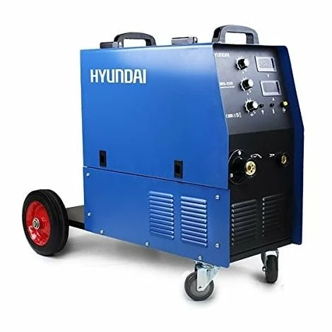 The HYMIG-200I is a heavy duty and incredibly versatile single phase MIG/MMA welder from Hyundai. The HYMIG-200I is capable of welding mild steel from 0.8mm to 8mm. Weighing only 48kg, the HYMIG-200I is easy to transport thanks to its mounted handles on the heavy duty steel case with powder coated finish for extra corrosion resistance and trolley wheels with Gas bottle holder at rear. Accessories include MIG welding torch with 3m cable, earth clamp with 2.5m cable and brush The HYMIG-200I MIG welder features a stepless regulator for infinite variable control of the welding current with a low current facility for effective welding of thinner materials. The welding (output) current of the HYMIG-200I can be regulated within the range of 50-200 Ampere making the HYMIG-200I adjustable to suit welding different materials and thicknesses of steel. Beware of lower quality models by always checking the ‘Duty Cycle’. Duty cycle is the amount of time, within a 10 minute period the welder can be used, on a given output. For example, this 200A welder has a duty cycle of 60% when used on 200A output (MIG). This means it can be used for six minutes in any ten minute period. Cheaper, lower quality welders claim to be a certain Amperage output, but can have a very low duty cycle on the output they have claimed. Always check the duty cycle to ensure you are getting the best value for money. Fitted with thermal overload protection to ensure maximum durability. Suitable for welding steel, stainless steel, copper, nickel, titanium and their alloys. Suitable for fabricators, farmers, home mechanics, auto and mobile technicians and DIY enthusiasts the HYMIG-200I is a good all rounder for welding with applicable wire size of 0.8mm Flux or 1.0mm Solid Core. The HYMIG-200I features high frequency starts allowing for smooth arc strikes. With low service and maintenance requirements, the HYMIG-200I is incredibly easy to use and maintain, and has full Hyundai UK parts back up. ( DELIVERY UPDATE: Please note that we offer Free Shipping to Mainland UK only! All other deliveries to any British Islands, Channel Islands, Isle of Wight, Isle of Man, Scilly Isles, the North of Scotland and Scottish Highlands & Islands will come with additional delivery charges. Due to circumstances beyond our control, we’re unfortunately now no longer able to deliver to residential addresses in Northern Ireland & Ireland)